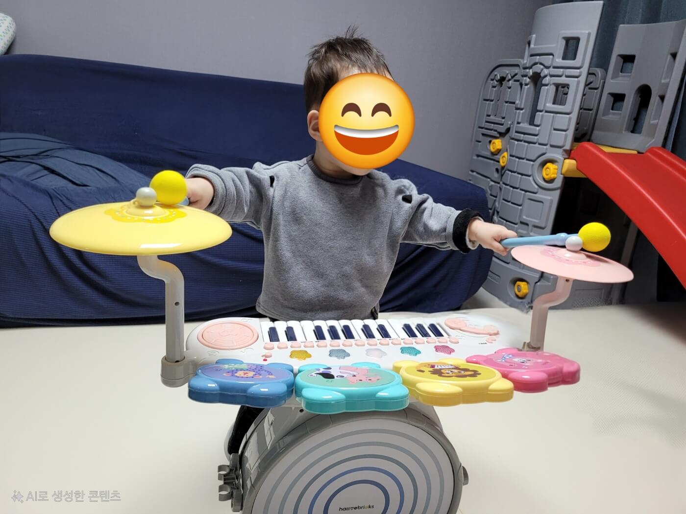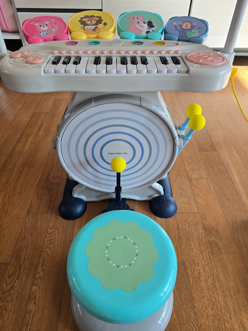 저희 부모님께서 작년에 크리스마스 선물로 하베브릭스 피아노드럼을 사주셨는데, 아이가 이 피아노드럼을 보자마자 앉아서 피아노도 쳐보고 심벌즈도 쳐보고 이리저리 노래버튼을 눌러서 음악에 맞춰 춤을 추는 등 굉장히 좋아했습니다.